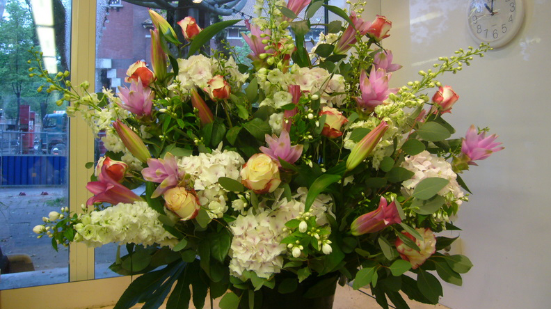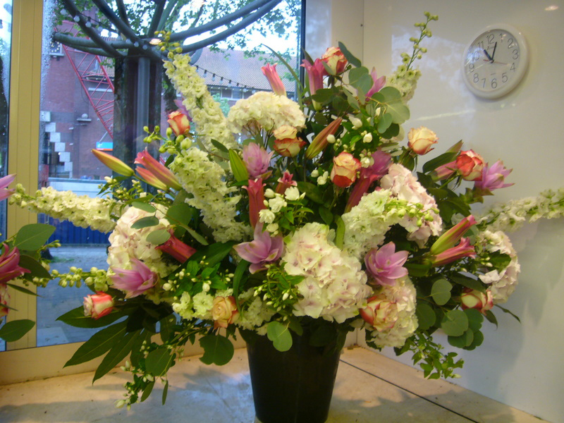 Hier een voorbeeld met o.a. hortensia, witte ridderspoor, jasmijn, roze curcuma, grote lelies en rozen.