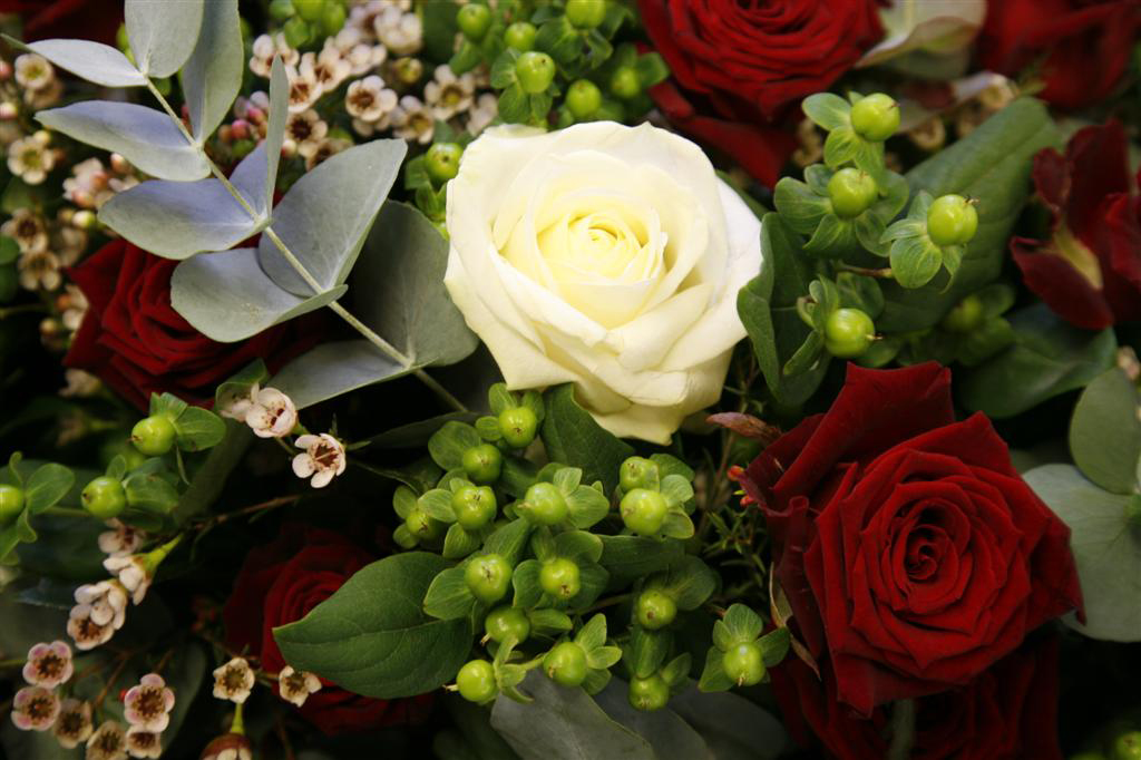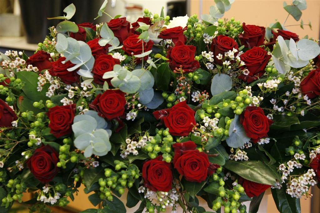 Als voorbeeld een rouwwerk met rode rozen, eucalyptus, hypericum, waxflower.