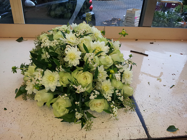 rouwwerk met witte rozen en dahlia's